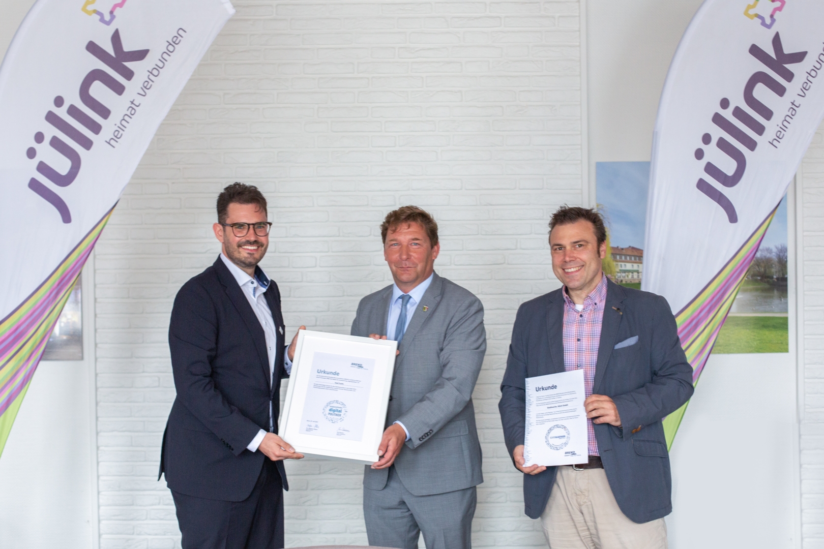 Mit dem Qualitätssiegel „Echte Glasfaser“ zeichnete der Bundesverband Breitbandkommunikation e.V. (BREKO) die Stadtwerke Jülich GmbH (SWJ) aus, die Stadt Jülich wurde für ihre Vorreiterrolle in Sachen Glasfaser-Netzausbau geehrt.