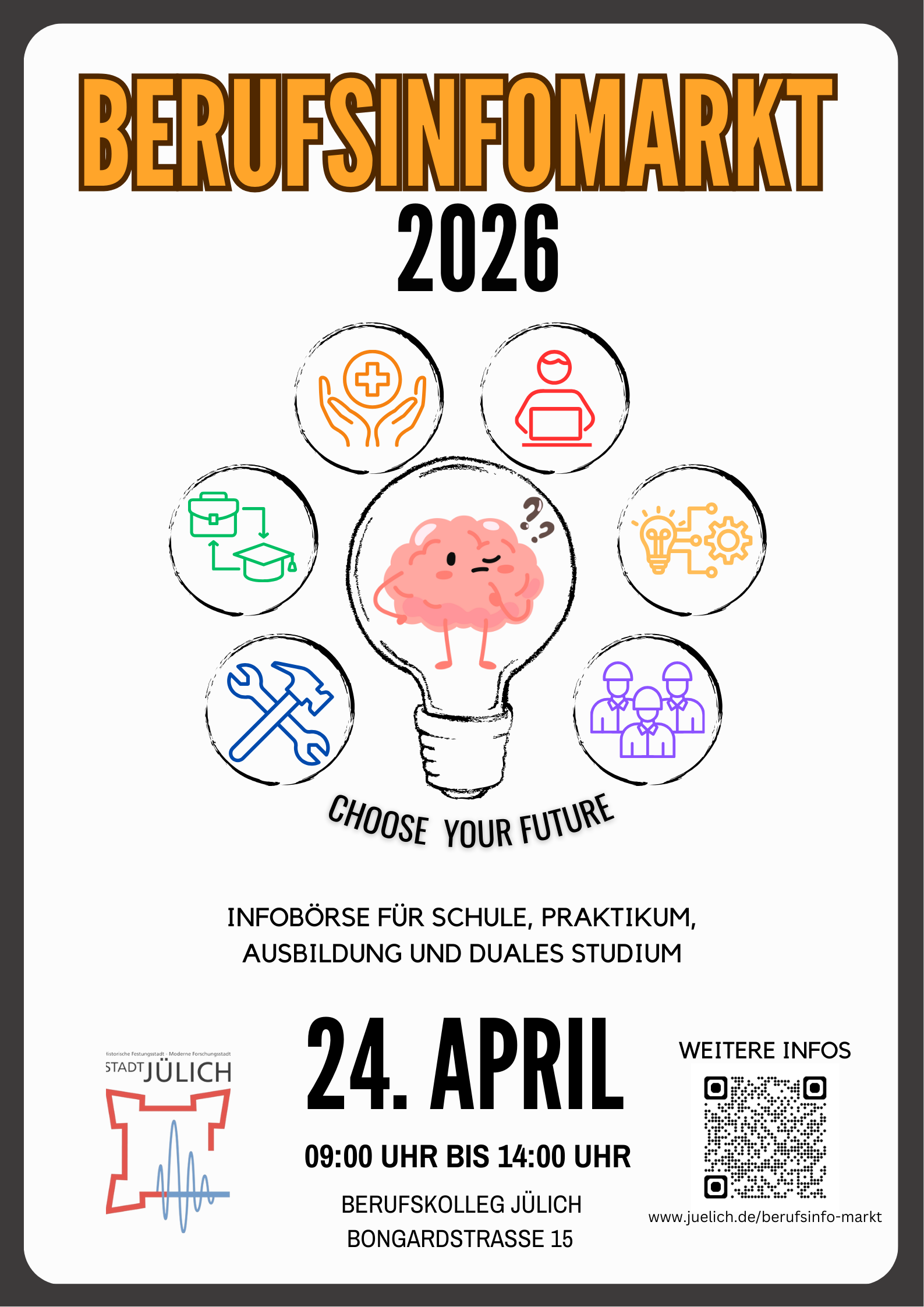 Am Freitag, 24. April 2026 ist es wieder so weit: Dann öffnet der Berufsinfo-Markt in Jülich seine Tore von 9 bis 14 Uhr im Berufskolleg an der Bongardstraße. Der Eintritt ist frei.