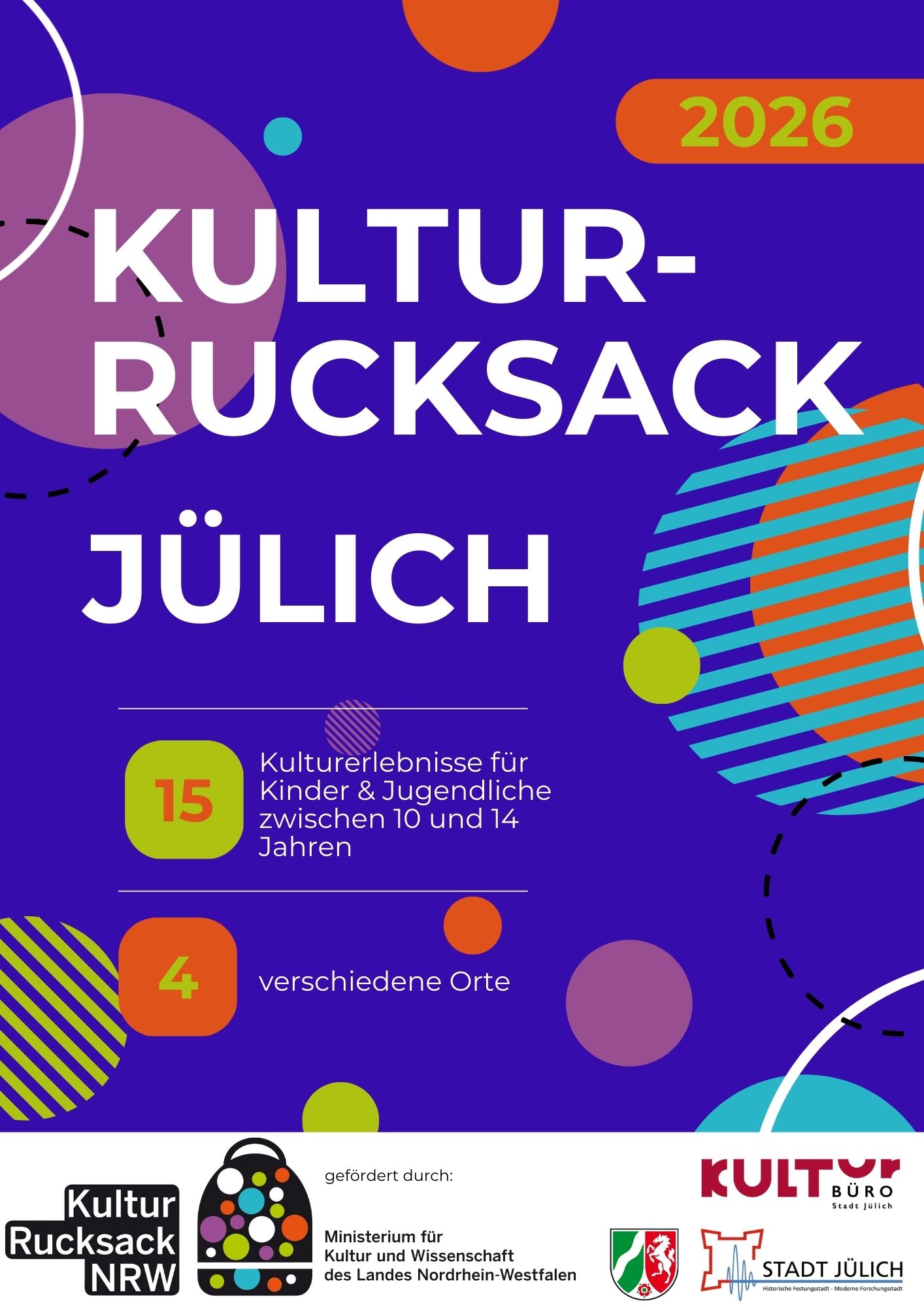 Deshalb hat das Land NRW gemeinsam mit den Kommunen und Kultureinrichtungen ein neues Landesprogramm ins Leben gerufen: den Kulturrucksack Nordrhein-Westfalen. Auch in diesem Jahr hat das Kulturbüro der Stadt Jülich in Zusammenarbeit mit verschiedenen Kultureinrichtungen wieder ein abwechslungsreiches Programm für alle Jugendlichen im Alter von 10-14 Jahren auf die Beine gestellt.