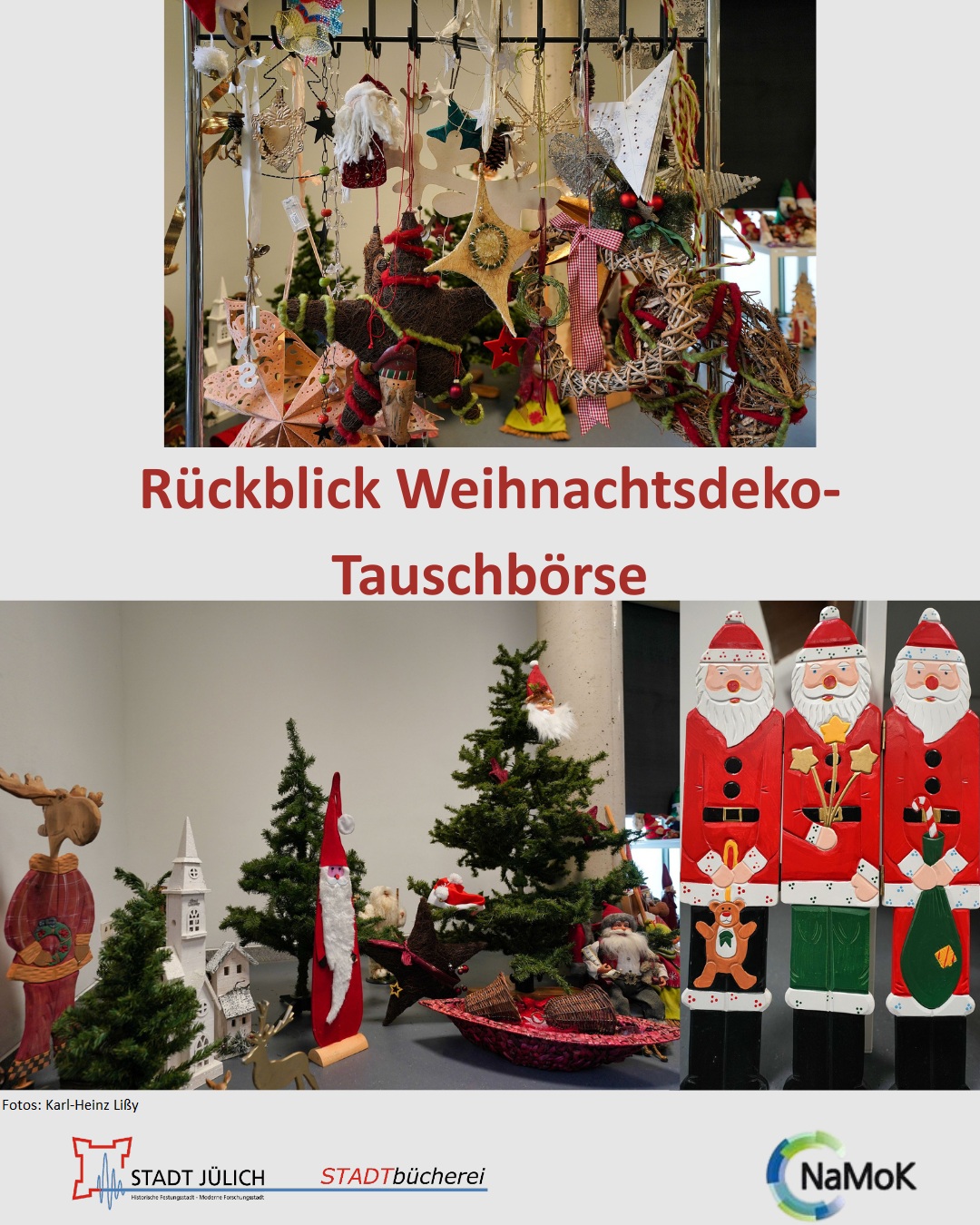 Bereits im Vorhinein gab es die Möglichkeit, Weihnachtsartikel in der Bücherei abzugeben. Am Aktionstag wurden dann ab zehn Uhr die Türen für den Tausch geöffnet. Der Raum war bunt gefüllt, von Christbaumkugeln, Lichterketten, Kränzen über Weihnachtsfiguren und –anhängern, es gab für alle etwas. Daneben gab es die Gelegenheit, das Repair-Café von Erfindergeist zur Reparatur von defekten Haushaltsgeräten oder auch Lichterketten aufzusuchen. Wer noch Lust und Zeit hatte, konnte sich beim Fröbelstern- und Weihnachtsschachtelfalten kreativ austoben.